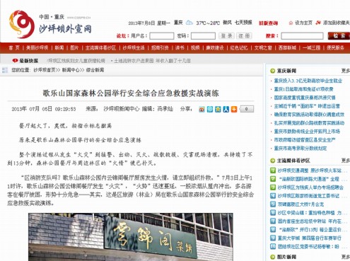 為了檢驗沙坪壩區(qū)旅游行業(yè)應急救援綜合隊伍能力,提高游客消防安全意識,全力遏制重特大火災事故及擁擠、踩踏事故發(fā)生。據(jù)重慶消防了解到,7月3日,沙區(qū)消防支隊聯(lián)合區(qū)旅游局在歌樂山國家森林公園舉行2013年安全綜合應急救援演練。